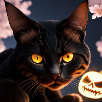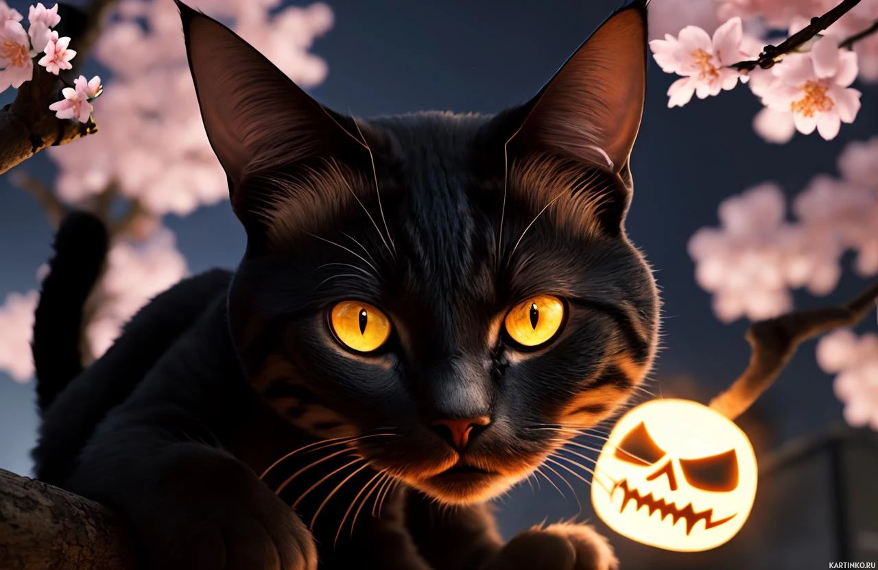 carved pumpkin, also known as a jack-o'-lantern, on the ground in front of the cat. Behind the cat are cherry blossom branches, indicating a setting with