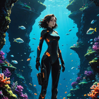marine life such as fish, which adds to the sense of being in a rich and diverse underwater ecosystem. The artwork has a high level of detail, particularly in the textures of the diving suit and the water, conveying a sense of realism despite the fantastical elements present. The color palette is predominantly cool tones, which may be indicative of cold or deep-sea environments, enhancing the otherworldly atmosphere suggested by the presence of fish that are not typical to everyday aquatic life.