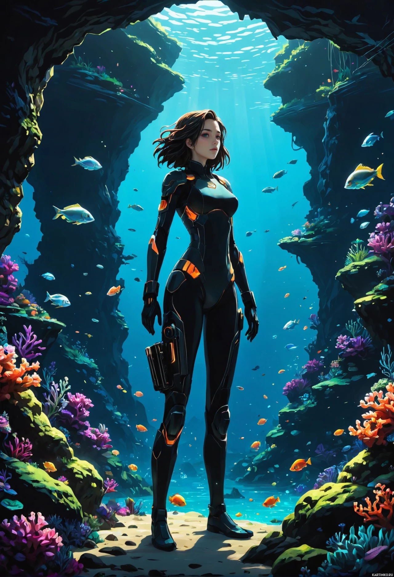 brown hair and is wearing a black diving suit that seems to be designed for water exploration or perhaps an extraterrestrial environment, given the sleek and futuristic look. She is holding a device that could be part of her equipment for this type of activity, possibly used for communication, navigation, or monitoring. The background features a cave opening with