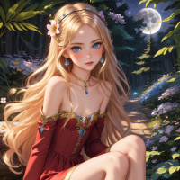 a night sky with a full moon visible. Her expression is thoughtful, and she seems to be gazing into the distance. The overall atmosphere of the image suggests it could be part of a larger fantasy-themed narrative or game.