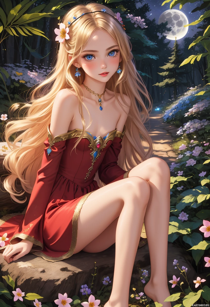 blonde hair and is wearing a dress with a fantasy-inspired design. The character is sitting on what appears to be