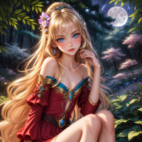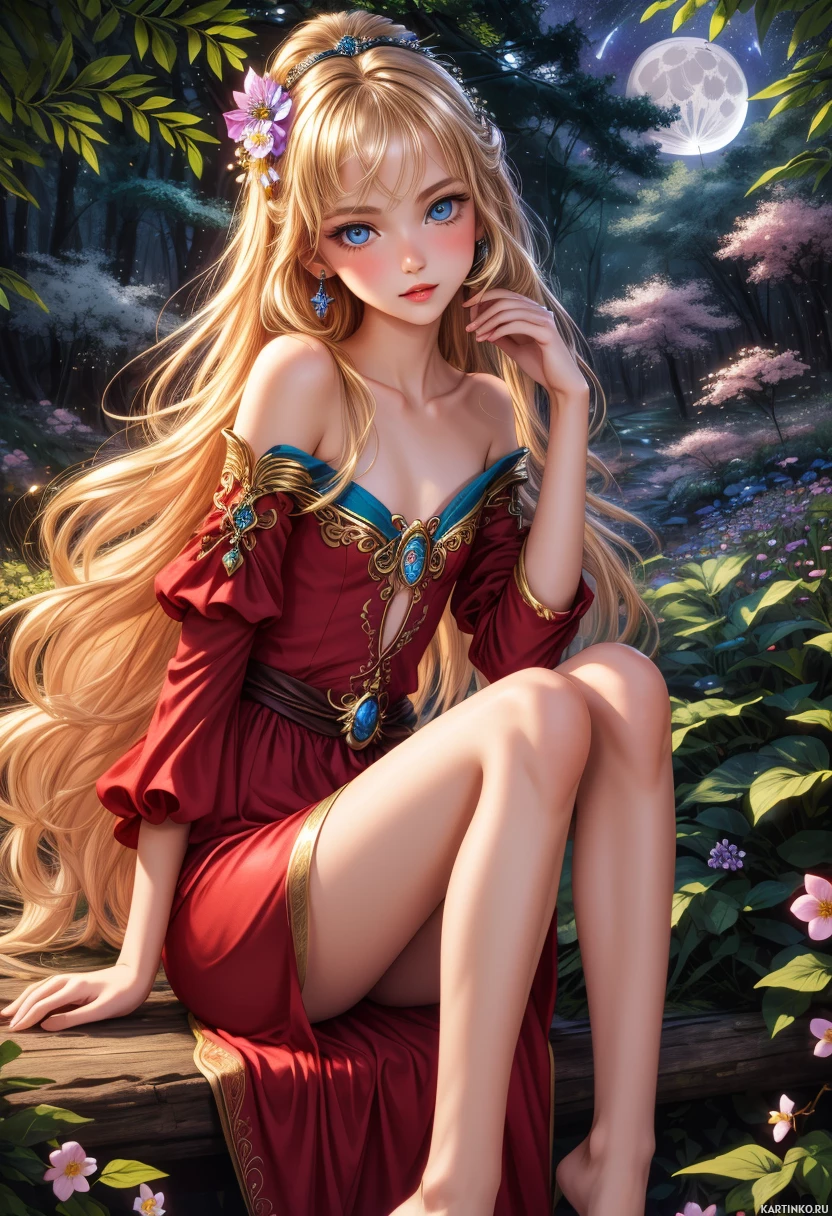 blonde hair and is wearing what appears to be a medieval-style red dress with gold trim and a high collar. She is sitting on