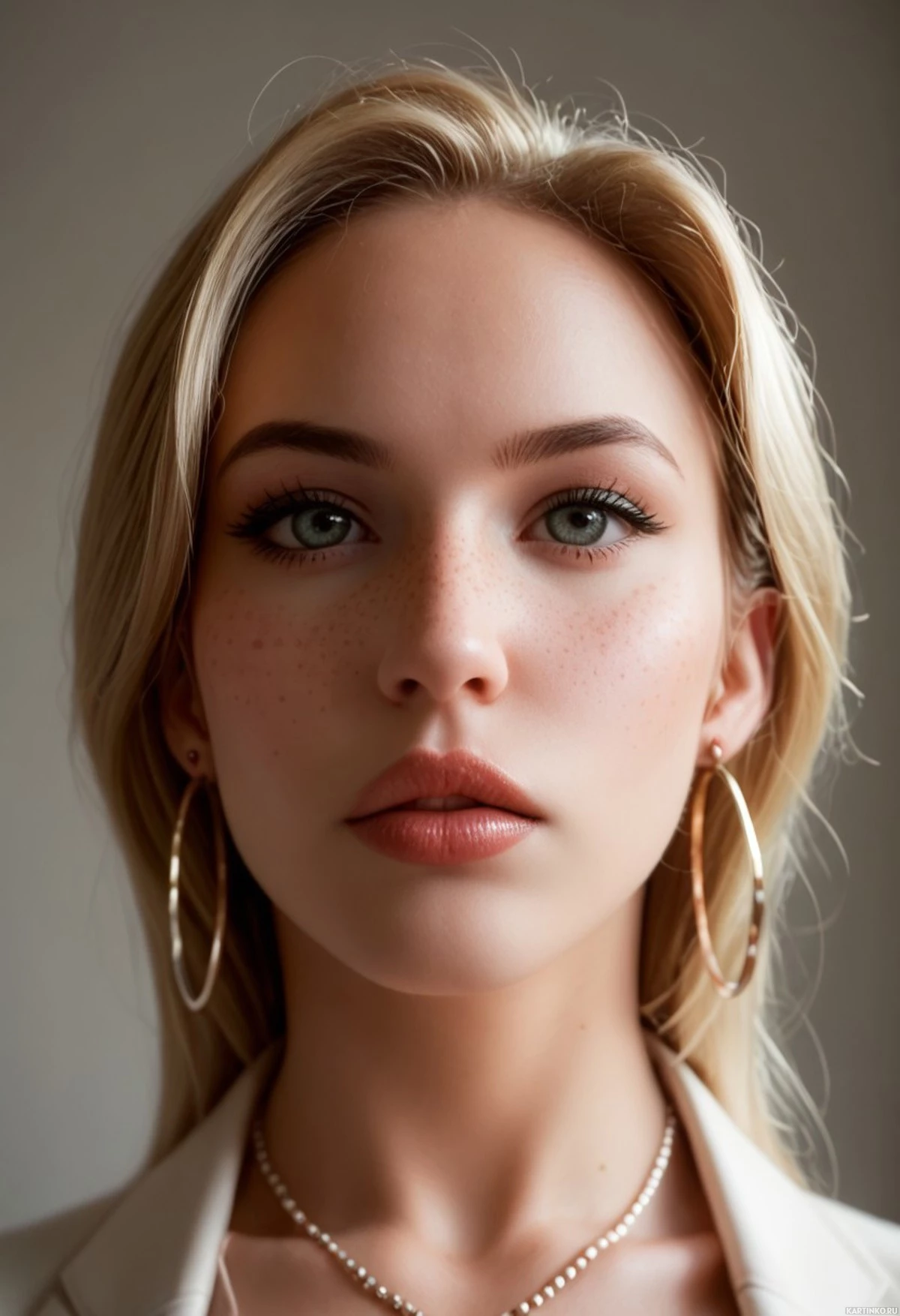 hoop earrings on each ear, which add to her stylish appearance. There is no visible clothing or other accessories as the focus is solely on her face and upper neck area. The background of the photo is plain and does not distract from the subject.