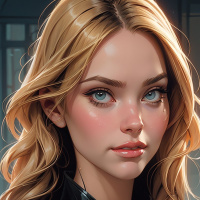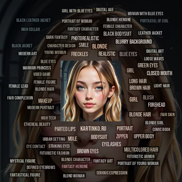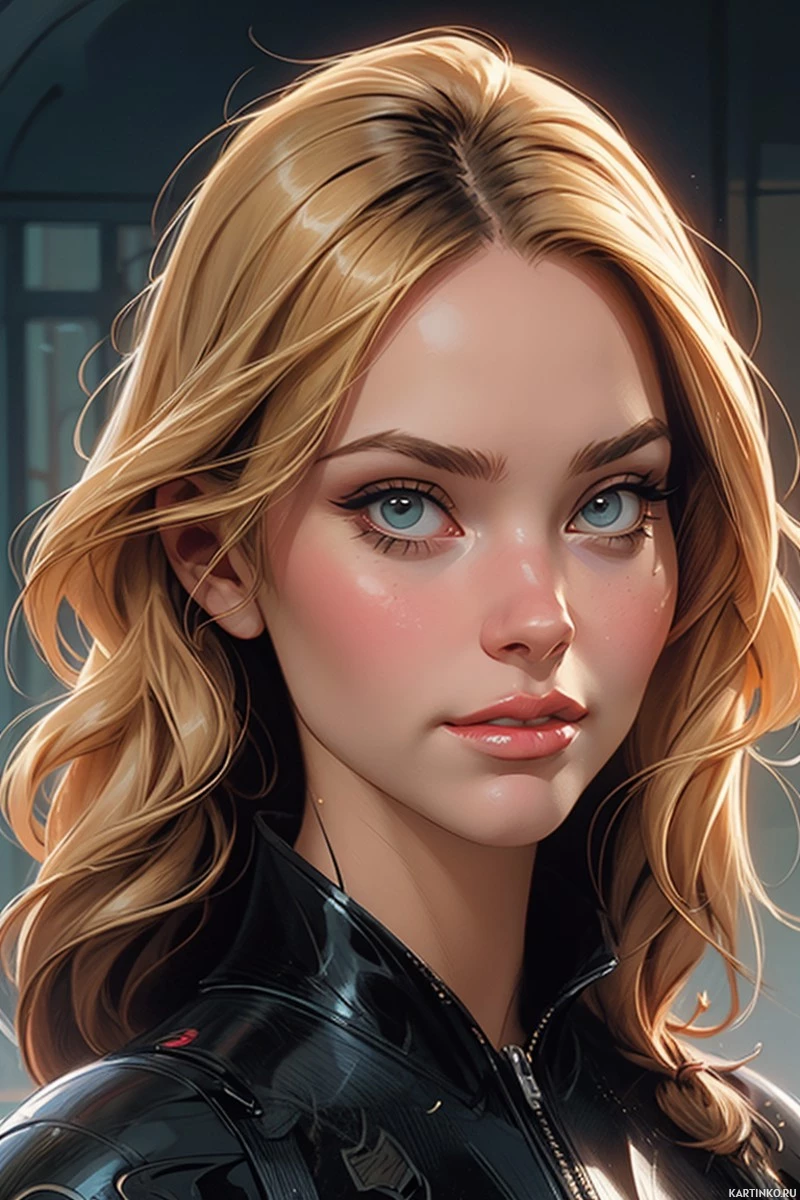 На картинке изображена молодая женщина со светлой кожей и голубыми глазами. У неё светлые, почти блонд, волосы, уложенные лёгкими волнами. Макияж включает чётко очерченные брови, тёмные тени для век и, кажется, помаду нейтрального оттенка. На ней чёрная кожаная куртка или жилет, напоминающий стиль героев комиксов – с высоким воротником и деталями, которые могут указывать на то, что это часть костюма. Взгляд направлен в сторону, избегая прямого контакта с камерой, что придаёт ей задумчивое или настороженное выражение.