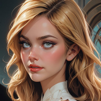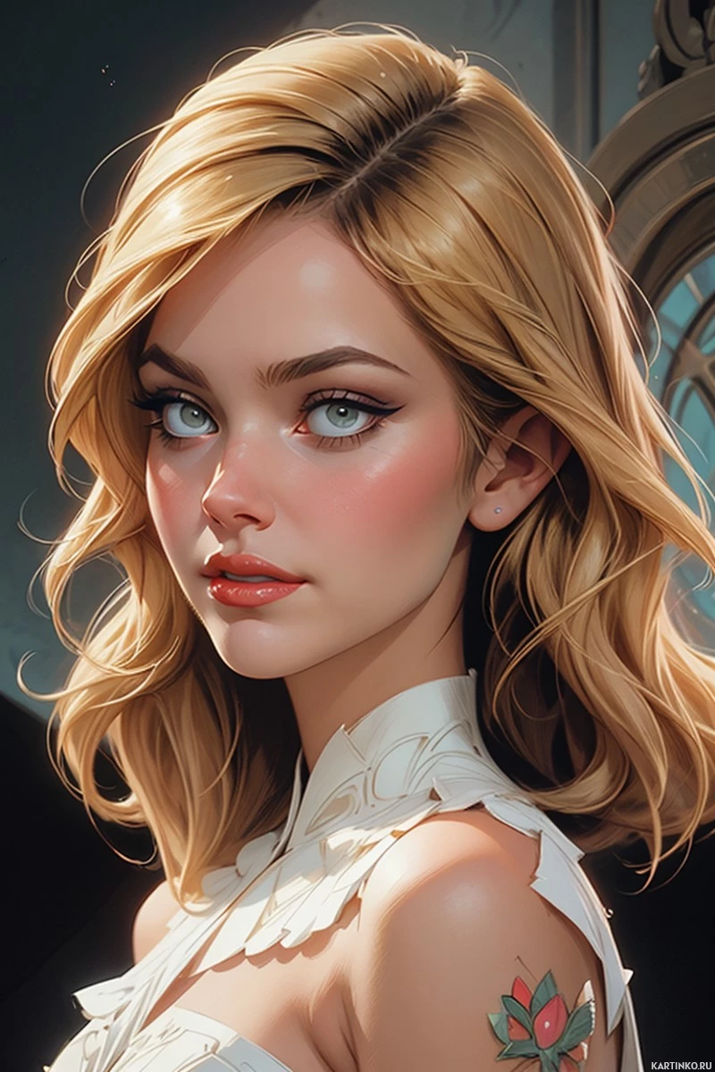 a young woman with fair skin and blonde hair styled in loose waves. She has prominent features such as large,