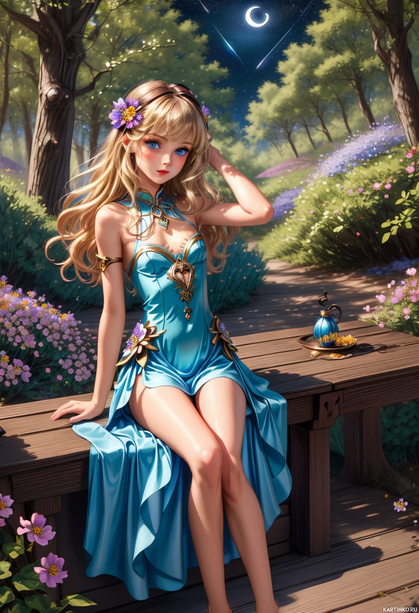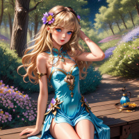 an elegant dress that appears to be inspired by fantasy or Renaissance-style clothing, complete with intricate details and a light blue hue. In front of her on the bench are various items including what looks like a small teapot, suggesting a casual or relaxed scene. The setting is further embellished with flowering trees and