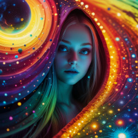vibrant colors such as blue, purple, yellow, and red. The background of the image is dark, which contrasts with the brightly colored elements around the woman's head. The overall style of the illustration suggests a fantasy or science fiction theme, possibly influenced by cosmic or