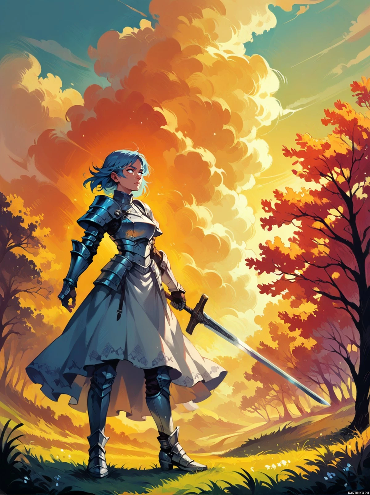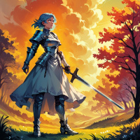 a female figure with blue hair, wearing armor and holding a sword. She stands confidently on what appears to be an outdoor pathway, possibly in a forest given