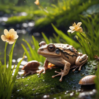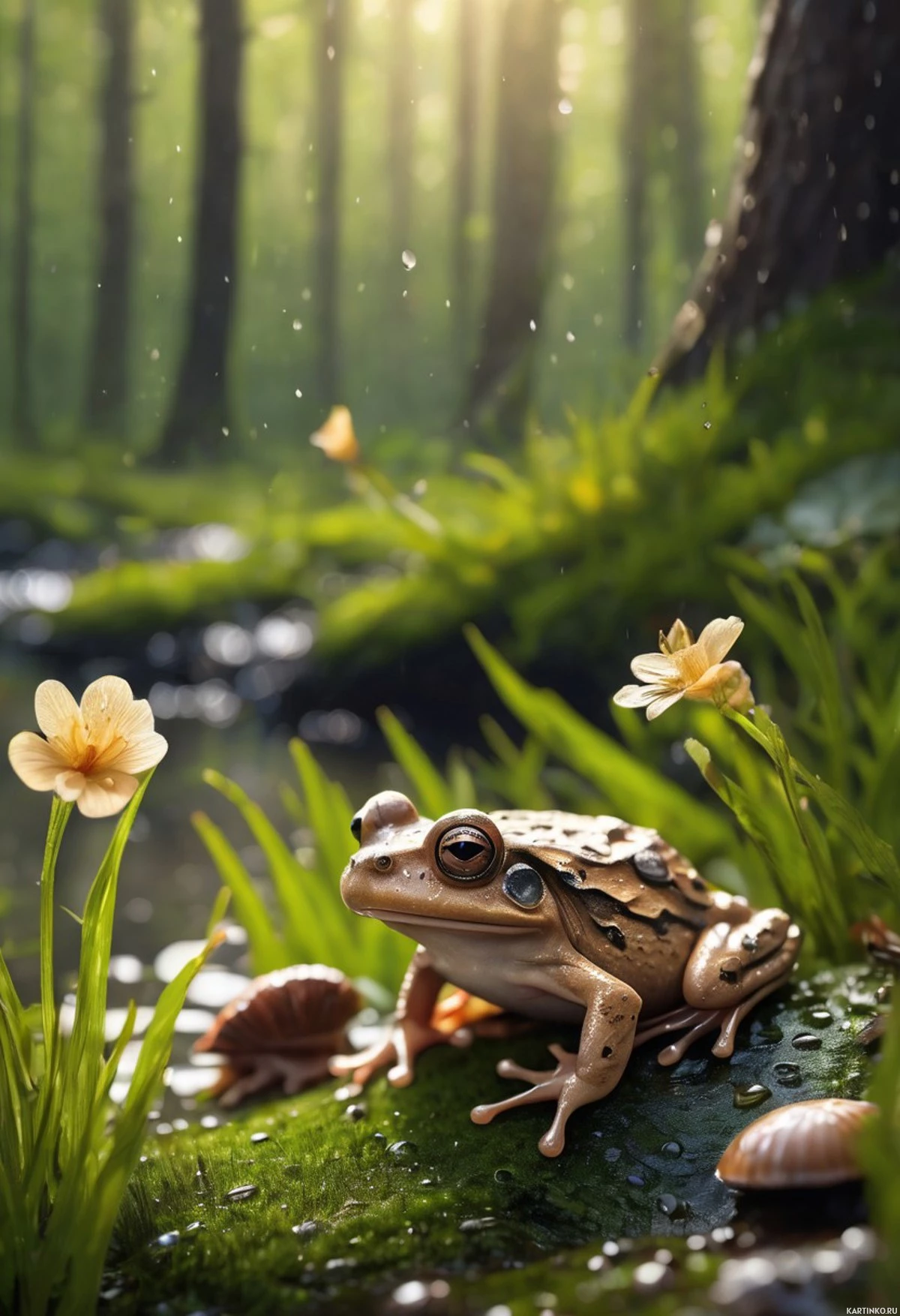 forest scene. In the foreground, there is a frog sitting on the ground, which appears to be wet due to