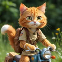 The image features a whimsical illustration of an orange tabby cat. The cat is anthropomorphized and dressed in human clothing, specifically a tan military-style outfit with a badge on the left shoulder. It has a backpack secured over its shoulders, indicating that it might be traveling or embarking on a journey. The cat's attire contrasts with its relaxed posture as it sits astride a motorcycle, wearing riding goggles for safety and holding onto the handlebars with both paws. The setting appears to be outdoors in nature, with grass visible under the motorcycle and trees in the background, suggesting a serene or wilderness environment. The style of the image is cartoonish and playful, evoking a sense of adventure and curiosity that one might associate with such an endearing character.