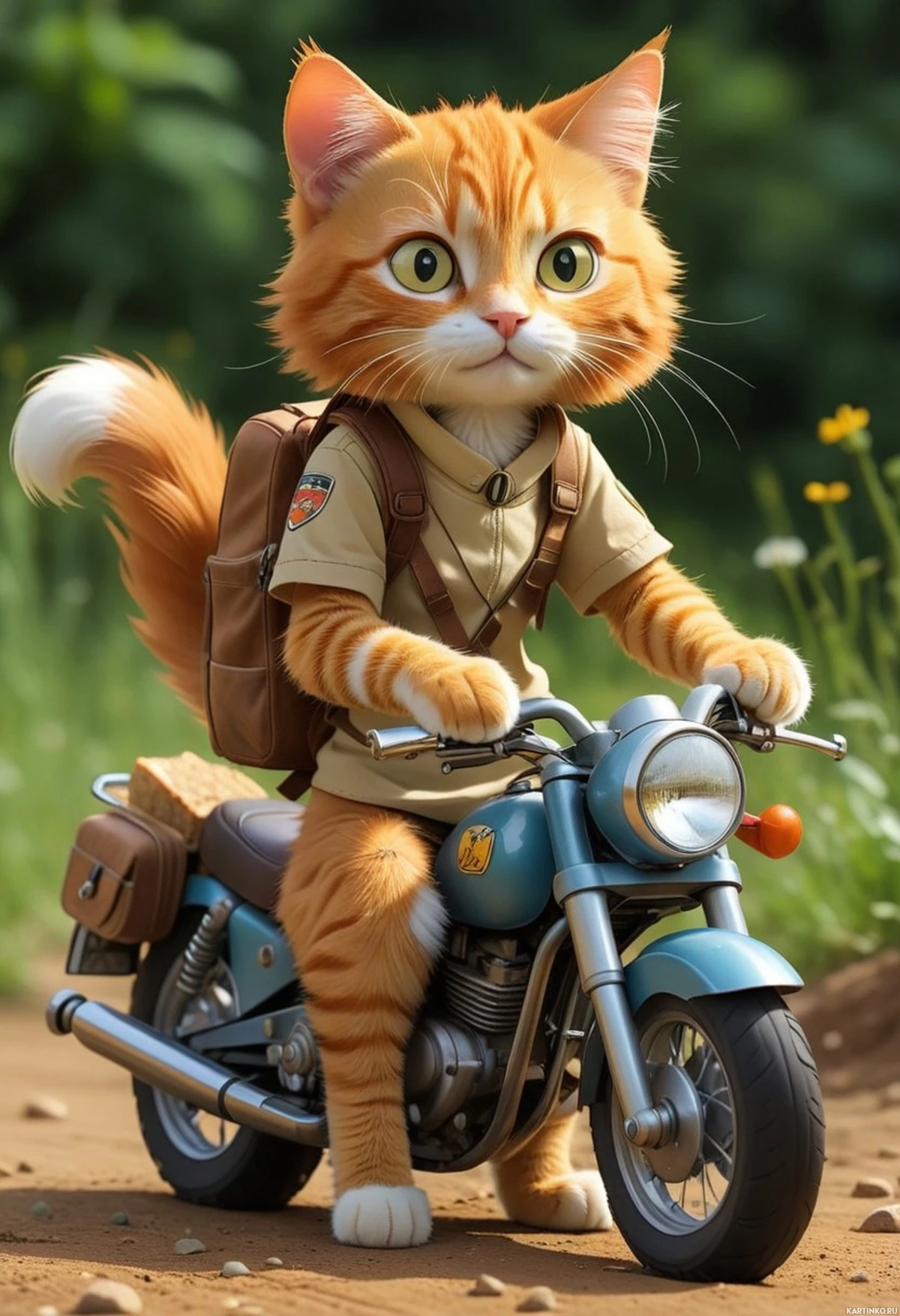 Картинка демонстрирует забавную иллюстрацию рыжего кота. Кот антропоморфен и одет в человеческую одежду, а именно в бежевый костюм в милитари-стиле с нашивкой на левом плече. На нем рюкзак, словно он собирается в путешествие. Его наряд контрастирует с расслабленной позой, в которой он сидит на мотоцикле, в защитных очках и с лапами, держащимися за руль. Фоном служит природа: под мотоциклом трава, на заднем плане деревья, что создает ощущение умиротворения и дикой местности. Стиль картинки мультяшный и игривый, вызывающий чувство приключений и любопытства, которые обычно ассоциируются с таким милым персонажем.