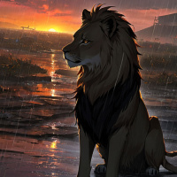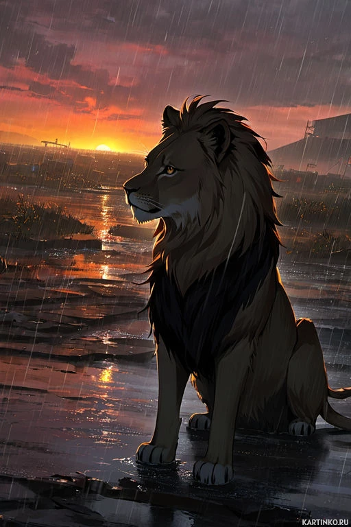 warm hues of orange, yellow, and red, contrasting with the cooler tones of blue in the background where the clouds are located. Raindrops can be seen falling against this backdrop, suggesting that it might have rained recently or is about to rain. The lion itself has a rich