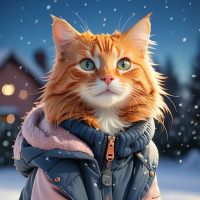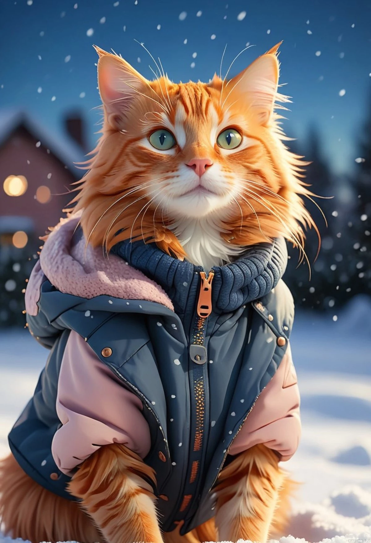 a warm glow that contrasts with the coldness outside. The overall atmosphere is one of tranquility and charm, with the cat seemingly enjoying or patiently enduring the weather conditions.