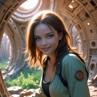 dark hair styled down, and their facial expression is pleasant and engaged, indicating that they might be in character as someone who enjoys such experiences. The setting around them includes what looks like a futuristic or