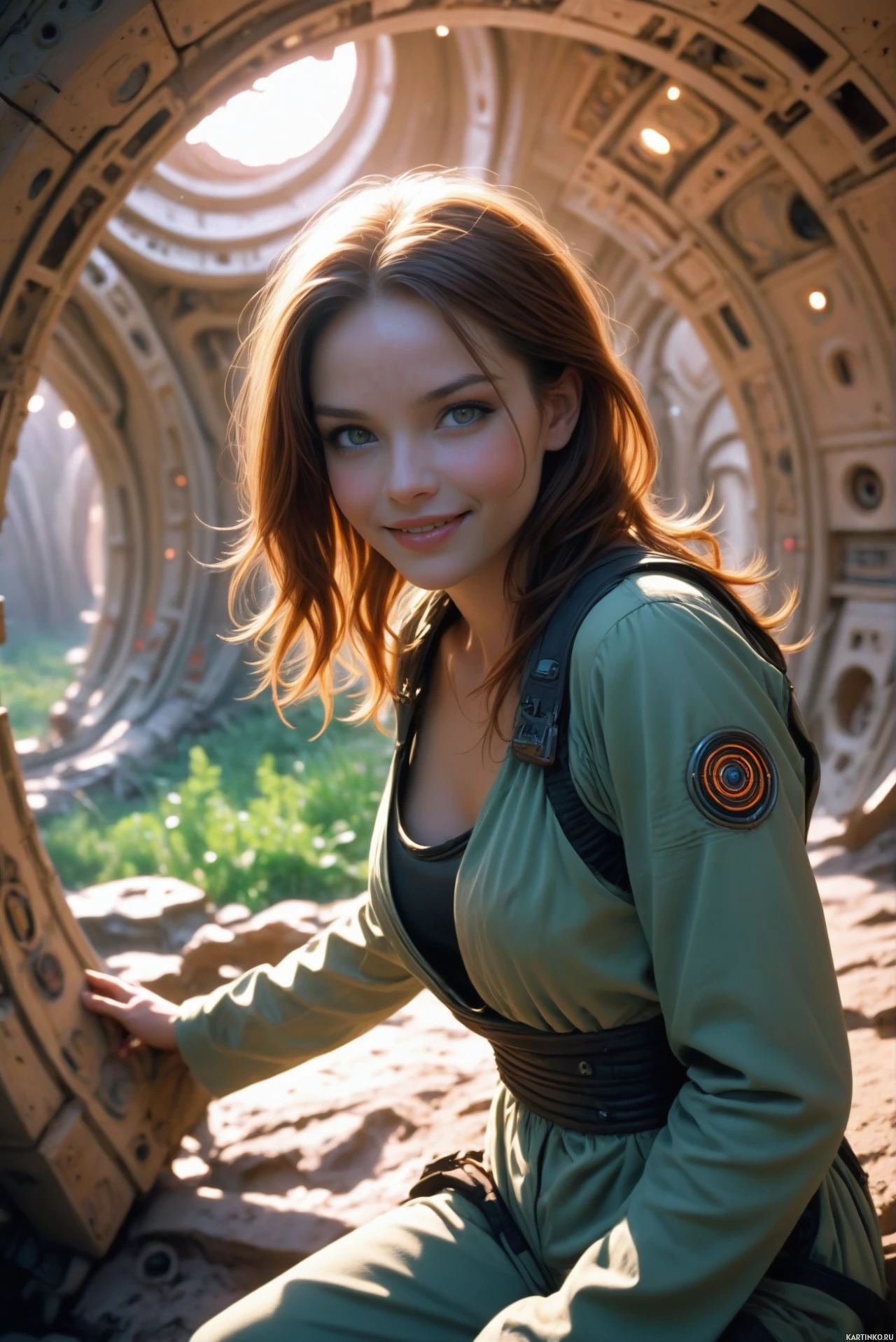 The image features a person sitting inside what appears to be a spacecraft cockpit or
