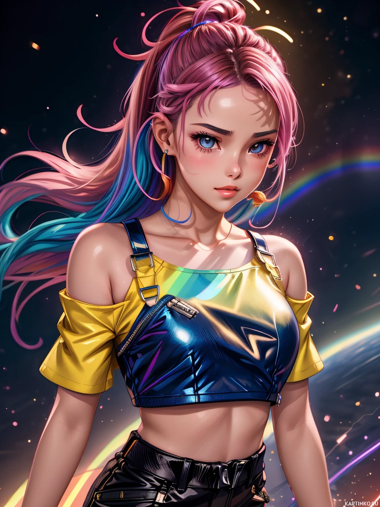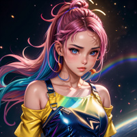blue eyes and is wearing makeup that highlights her eyes and lips. The character is dressed in a colorful outfit consisting of a yellow