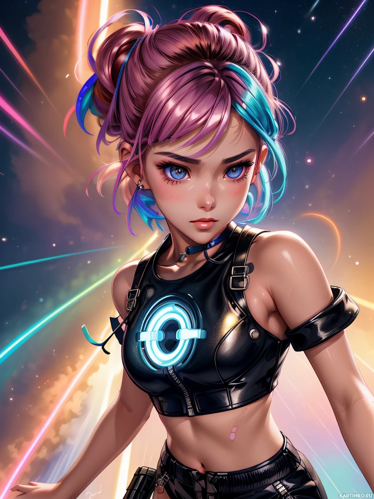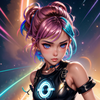 neon lights or cyberpunk aesthetics: blues, purples, pinks, and yellows. The overall style of the image suggests it could be from a video game, comic book, animation, or other forms of digital artwork designed to depict a futuristic or fantasy character.