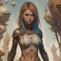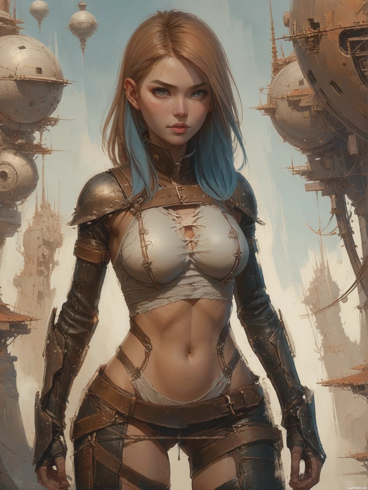 blonde hair and blue eyes, wearing a detailed armor with a breastplate that is torn on the sides, revealing her skin. There are also visible buckles around her waist. Her attire includes leather or metal bracers and greaves, along with a pair of leggings adorned with