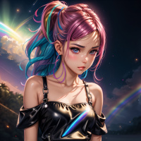pink hair with streaks of blue and black at the ends, styled in a way that suggests movement or a casual attitude. Her skin appears to be pale, and her features are detailed with shading that highlights her cheekbones and nose. The character is wearing a black