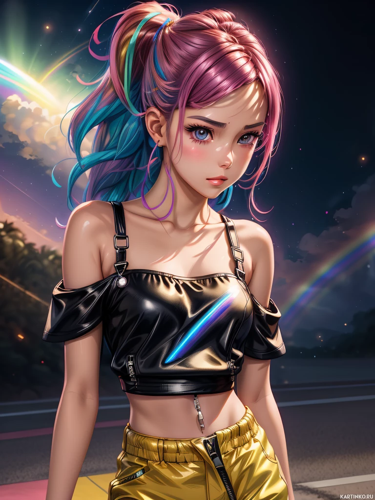 cargo pants, which have pockets visible along their sides. Her expression is neutral, and she seems to be looking slightly off to her left side. The background of the image is dark with what appears to be celestial bodies like planets or moons in a night sky, suggesting an outdoor setting during evening or night. There are also hints of light from stars or other celestial objects, adding to the nighttime atmosphere. The overall style and quality of the artwork suggest it could be used for various purposes such as character design for games or animation, or even for conceptual art in a broader sense.