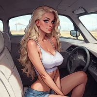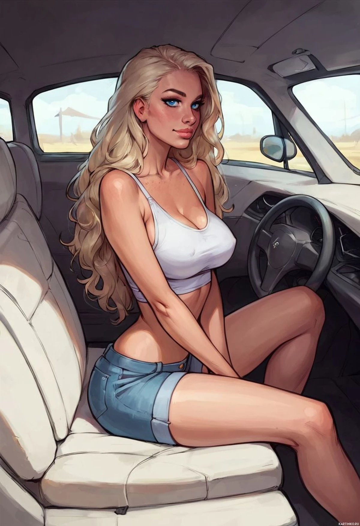 steering wheel is visible in front of her, indicating she is ready to drive. The background outside the car suggests