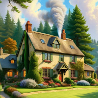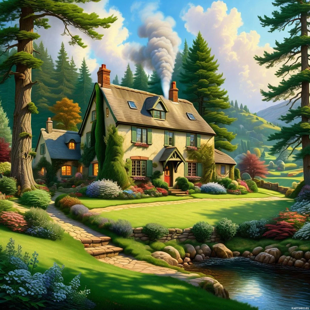 a picturesque scene of a quaint, single-story cottage with a red door, nestled in an idyllic setting. The house features a sloped roof with what appears to be a stovepipe chimney and several windows with