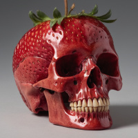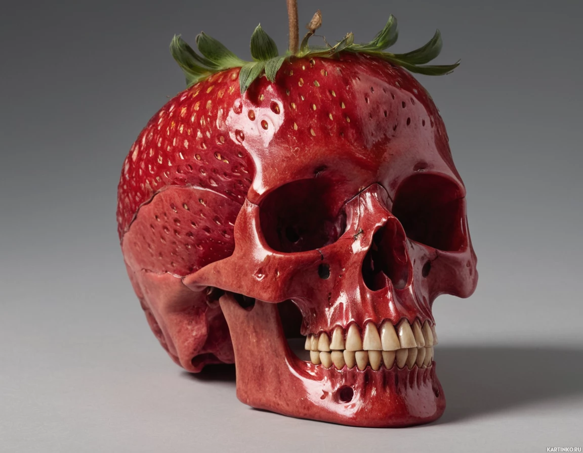 a human head. Atop this skull is placed a strawberry, which seems to be