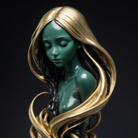 Картинка изображает скульптуру женщины с закрытыми глазами, в короне, с выражением глубокой задумчивости или созерцания. Ее волосы пышные и сложно уложены в струящемся узоре, имитирующем движение прядей. Цвета яркие, кожа имеет зеленоватый оттенок, контрастирующий со светлыми тонами ее одежды и короны. Также присутствует элемент, напоминающий змею или змеевидную структуру, обвивающую часть ее фигуры, что добавляет мистический или фантастический характер произведению. Скульптура установлена на постаменте, что говорит о том, что она может быть представлена как произведение искусства.