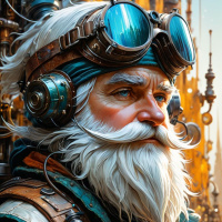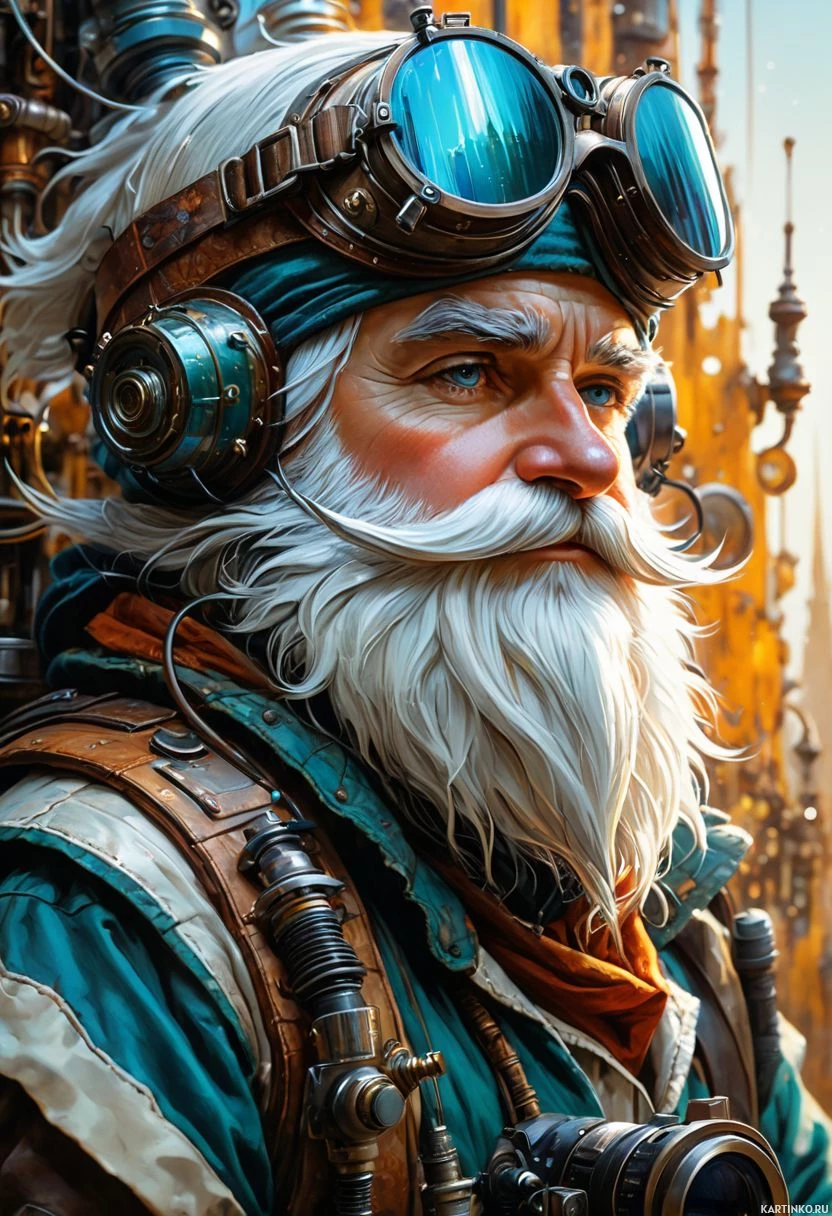 a prominent nose. His attire includes what looks like an airship engineer's outfit with multiple gears and dials visible on it, suggesting he might be involved in some sort of steampunk or