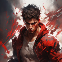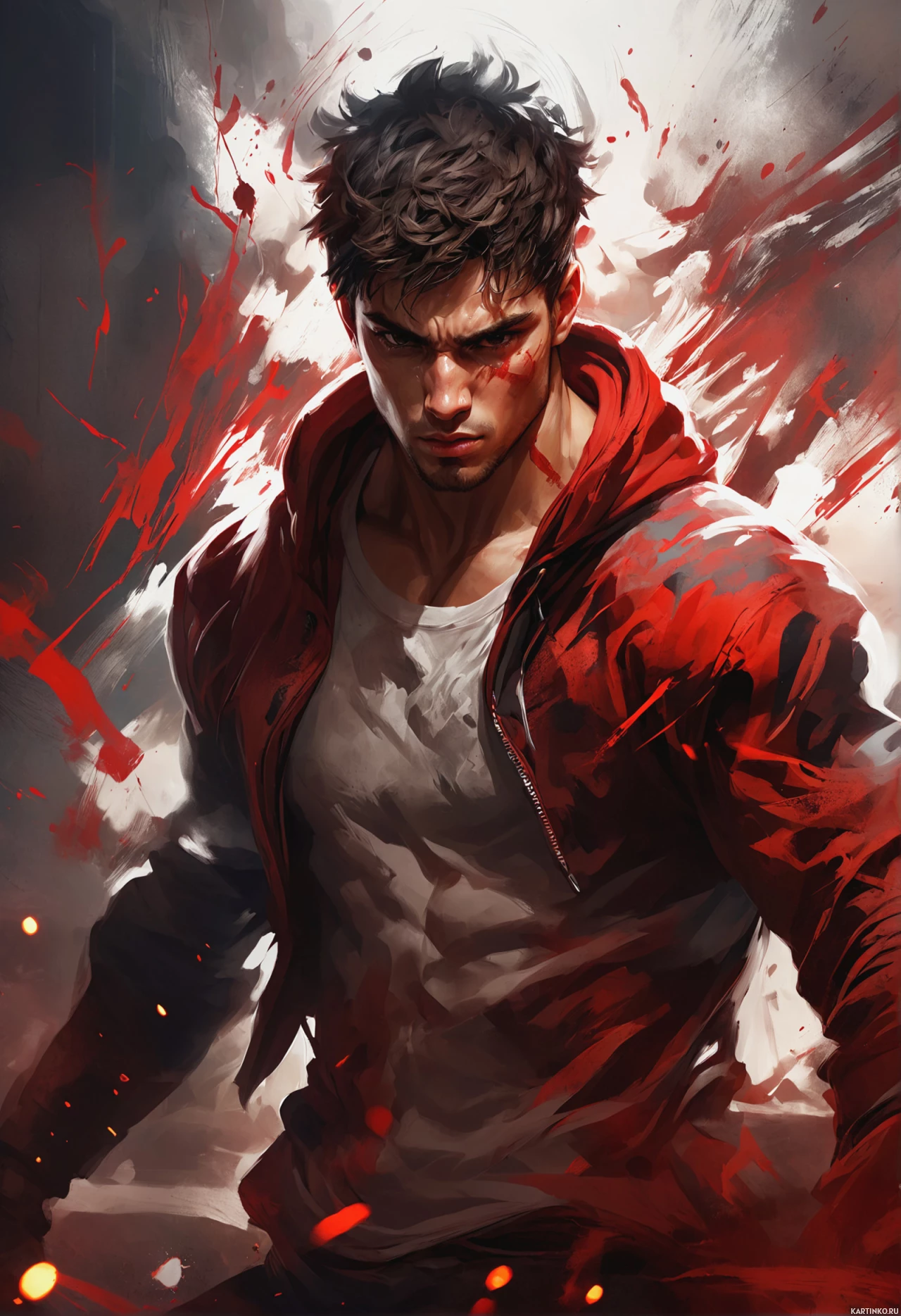 dark hair and is wearing what appears to be a red leather jacket over a white shirt, giving the impression of a superhero costume or a stylized outfit for a character. There are graphic elements around him, such as splashes of red and orange, possibly representing blood or energy. The background is split with one side showing an open sky with clouds and the other side depicting flames, suggesting