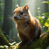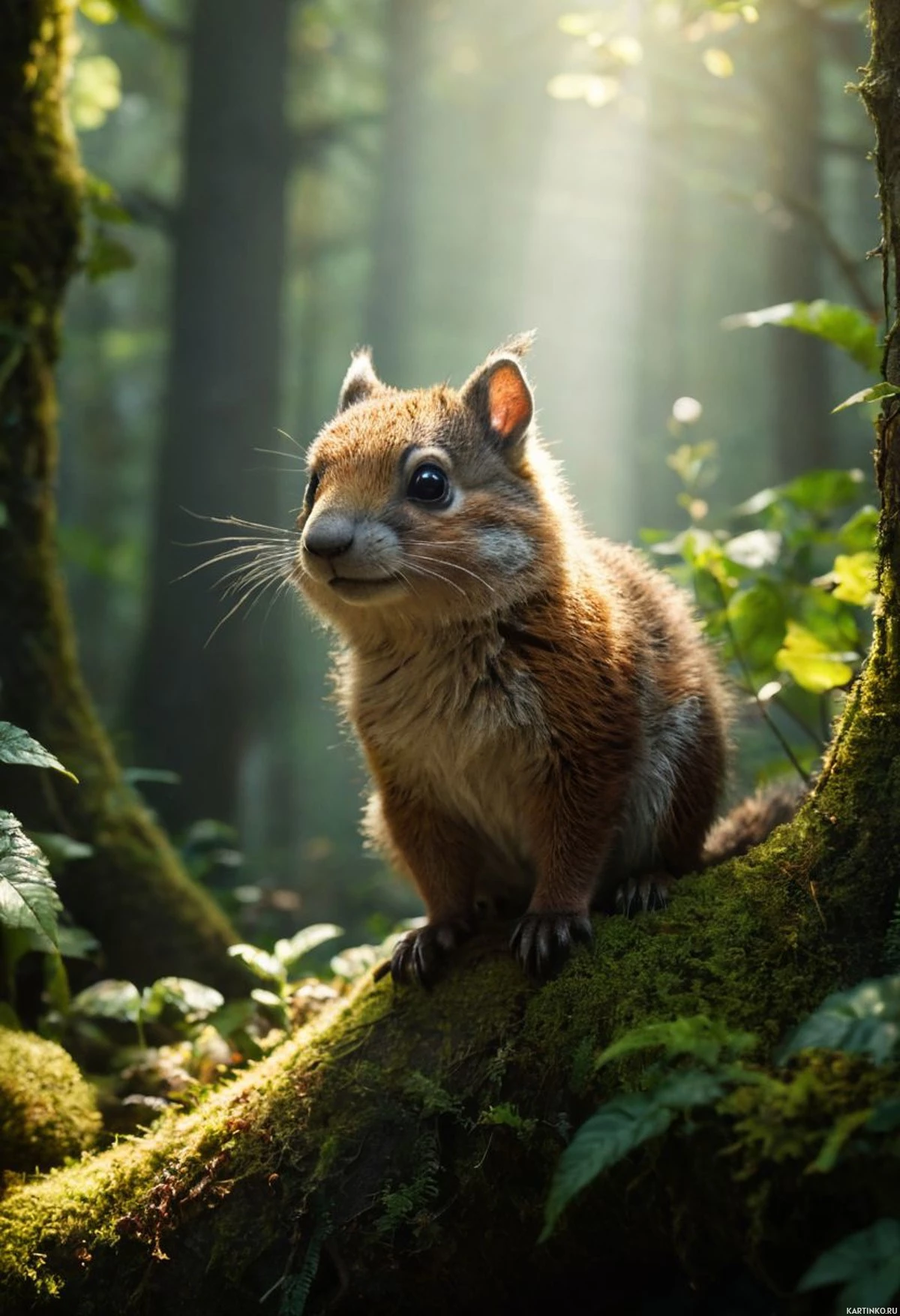 a fantastical scene featuring an animal that resembles a fox or a weasel. This creature is characterized by its red-brown fur, erect ears, and large