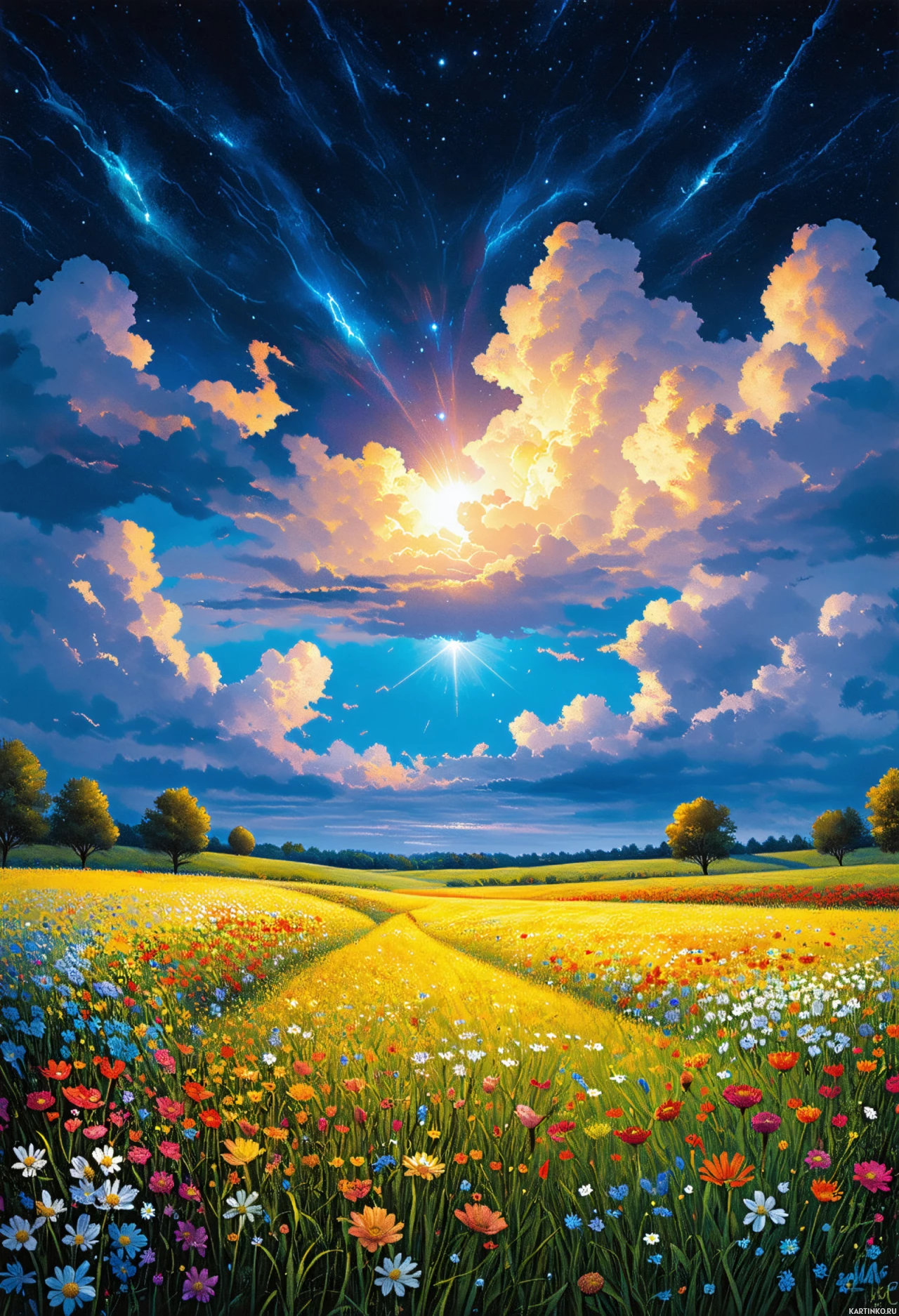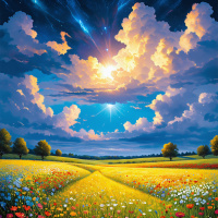 Картинка изображает фантастический и яркий пейзаж под драматичным небом. Вверху сцены – мощный разряд молнии, обрушивающийся из облаков, что намекает на бурное погодное явление. Ниже раскинулись тёмные грозовые тучи, занимающие верхнюю часть картинки. В контраст им – яркое и сияющее солнце в центре, пробивающееся сквозь них и освещающее пейзаж внизу. Пейзаж выглядит как пышный сад или поле, полное разноцветных цветов: красных, жёлтых, оранжевых, синих и фиолетовых оттенков. Цветы перемежаются с высокой травой, добавляющей текстуру. В нижней части картинки видна извилистая дорога, ведущая к солнечному пространству. Общий стиль работы очень стилизован, с акцентом на яркие цвета и динамичные контрасты, что придает ему ощущение сказочности или сюрреализма. Сочетание интенсивных погодных элементов и идиллической садовой обстановки создаёт противопоставление, которое может символизировать надежду или упорство перед лицом трудностей.