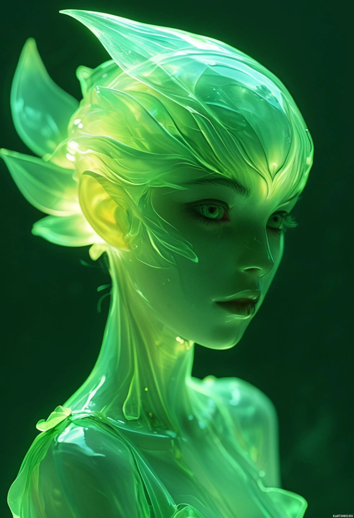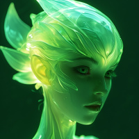 The image presents a 3D rendered figure that appears to be a blend of human and otherworldly features. It has green hair and is adorned with intricate, glowing patterns that suggest