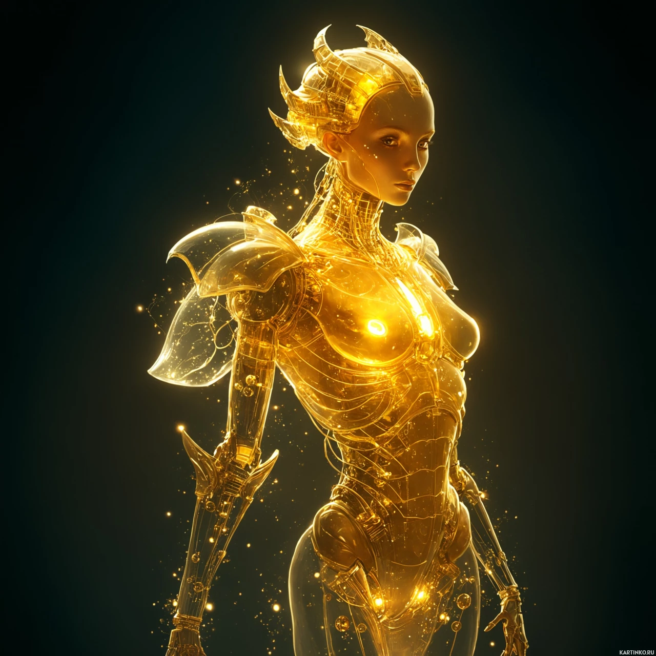 a humanoid form and stands upright, emanating an ethereal golden glow. Her attire includes intricate gold armor pieces, suggesting a futuristic or science