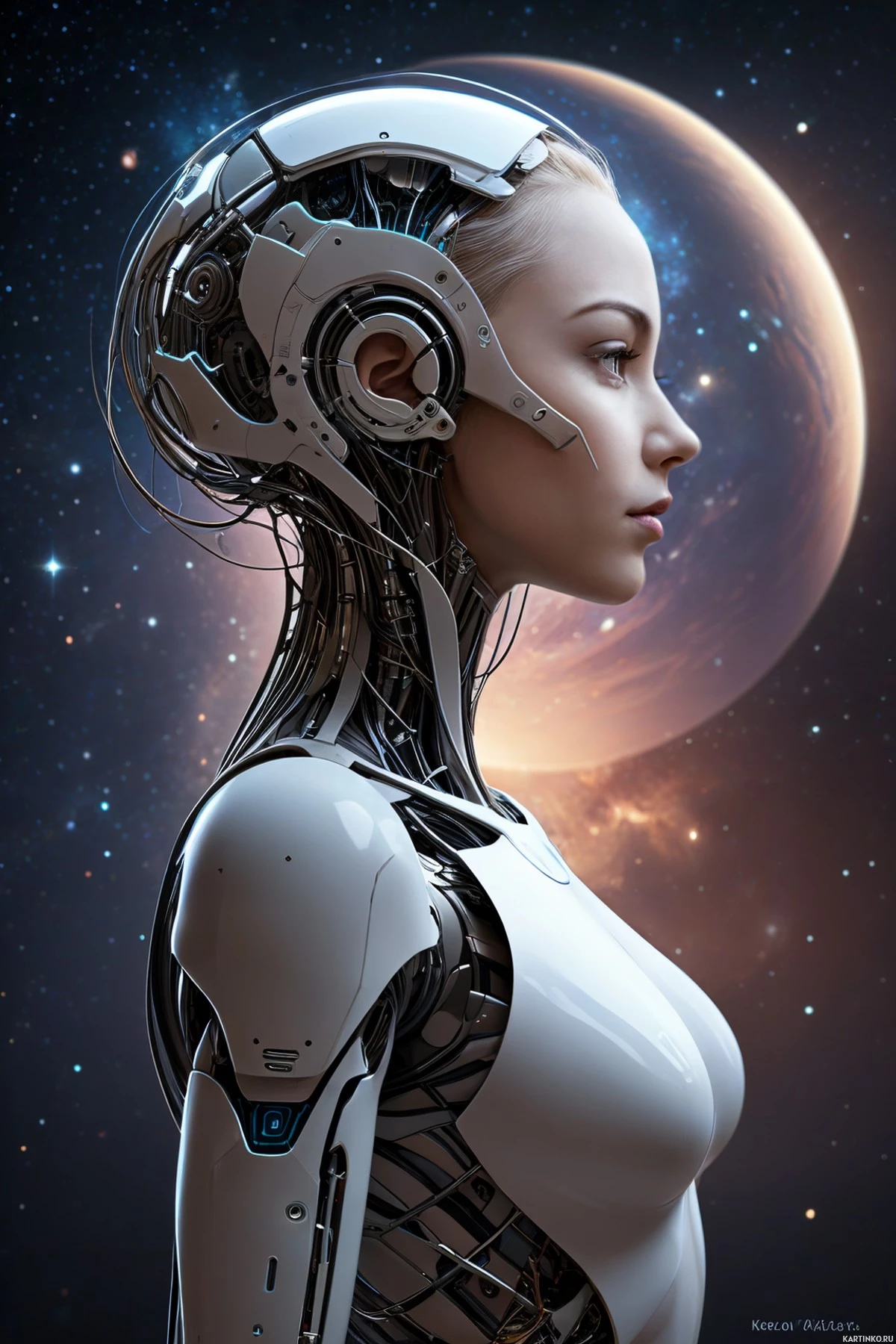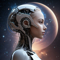 The image features a humanoid robot with mechanical endoskeleton, suggesting advanced technology and possibly science fiction themes. It has a female human-like face with blue eyes and a neutral expression. The robot is adorned with circuitry and technological components visible on its head and neck, indicating a sophisticated artificial intelligence or cybernetic enhancement. The background of the image depicts an otherworldly scene with a celestial body that resembles a planet with rings in the distance, conveying a sense of space exploration or extraterrestrial existence. The colors are predominantly cool tones, giving the impression of a cold and distant environment, which is often associated with science fiction narratives involving space travel.