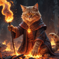 an ominous glow across the scene. Overall, the image portrays a whimsical yet eerie atmosphere, where the anthropomorphic cat takes center stage in a scene that blends elements of fantasy and horror.