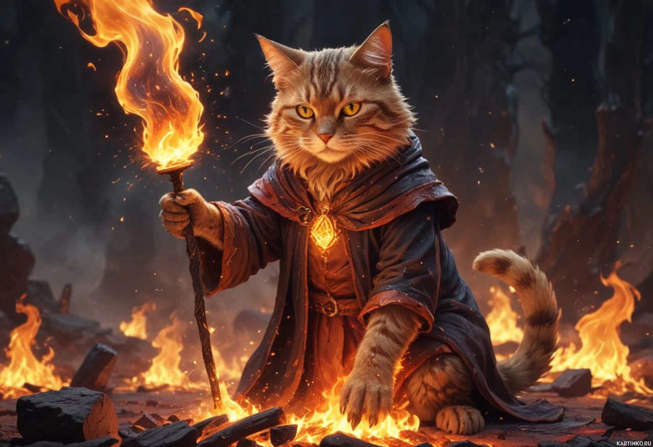 an anthropomorphic cat standing in a scene with fantastical elements. The cat has a humanoid posture, with its