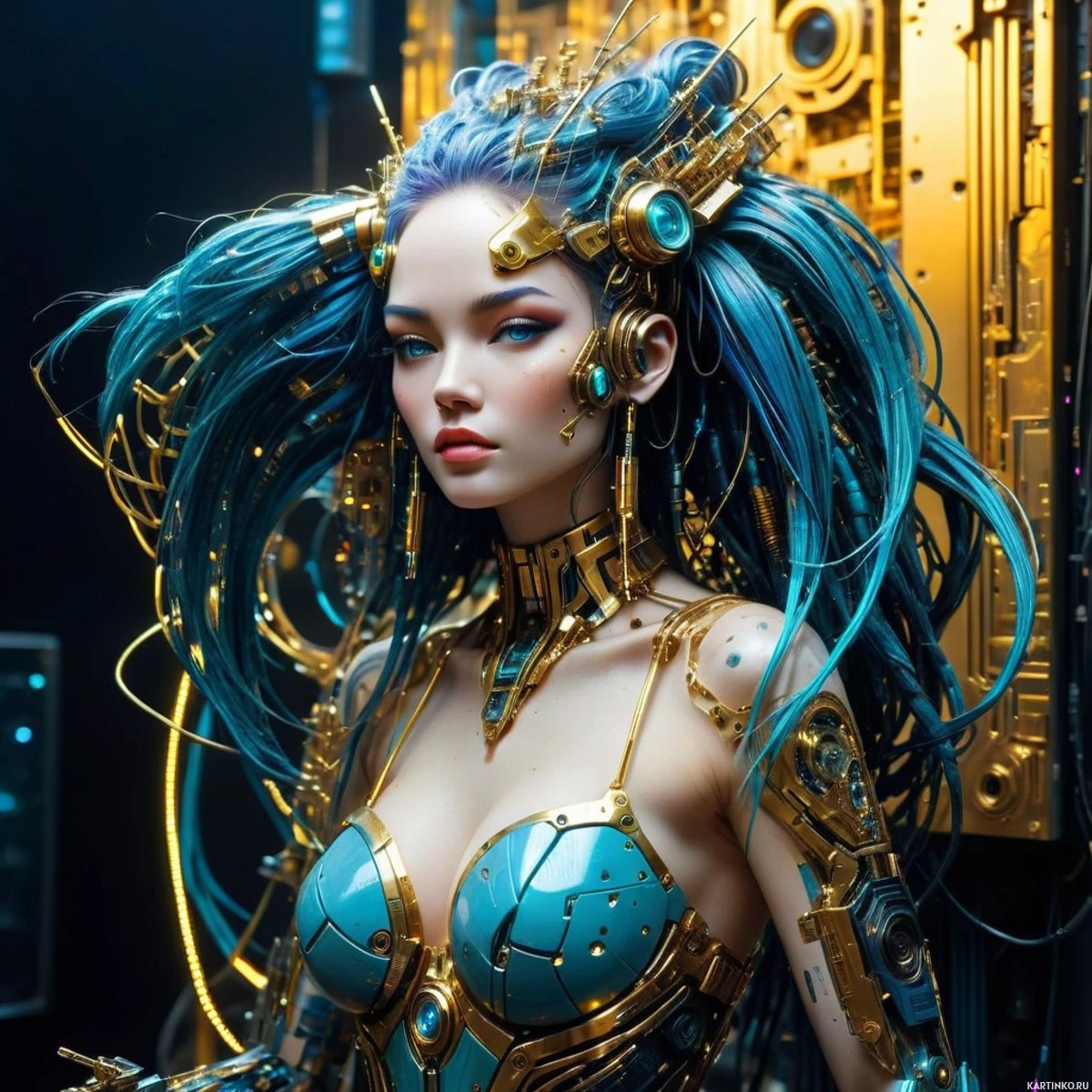 На картинке изображена девушка с яркими синими волосами и, похоже, золотыми или бронзовыми украшениями на лице и груди. На ней футуристический доспех или костюм, напоминающий древние технологии, возможно, вдохновленный эстетикой стимпанка. Выражение лица нейтральное, но уверенное. Фон предполагает высокотехнологичную среду с элементами механизмов вокруг нее. Стиль картинки отсылает к жанрам научной фантастики и скорее всего это иллюстрация, а не фотография.