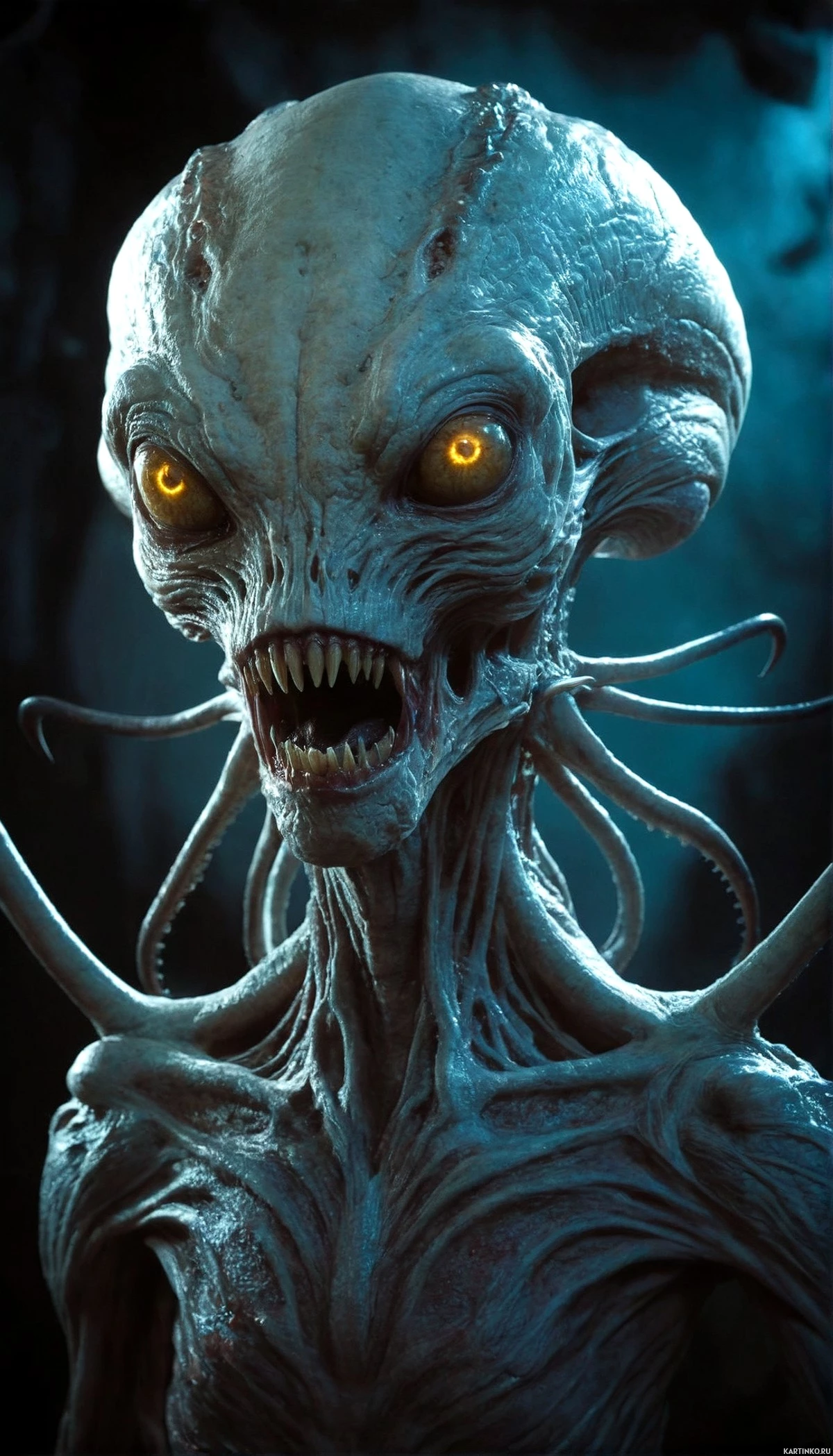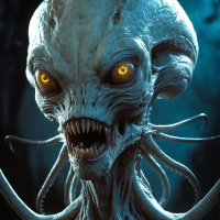 sallow skin and pointed teeth, giving it an unsettling and possibly malevolent appearance. Its eyes are reddish-orange, which could suggest aggression or malice. The character is not human but rather another species, likely designed to be a monster or alien. The setting appears to be dark or underwater due to the blue-