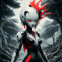 The image portrays a character that appears to be a fusion of human and mechanical elements, often associated with cyberpunk or science fiction genres. The character is adorned in sleek black armor, complemented by red accents. On the head, there's a unique headdress consisting of flame-like structures on either side. The character stands against a backdrop that includes rock formations and trees with a misty atmosphere, suggesting an otherworldly or alien environment. The artwork is detailed, with attention to texture and shading, giving the character and the setting a sense of depth and realism.