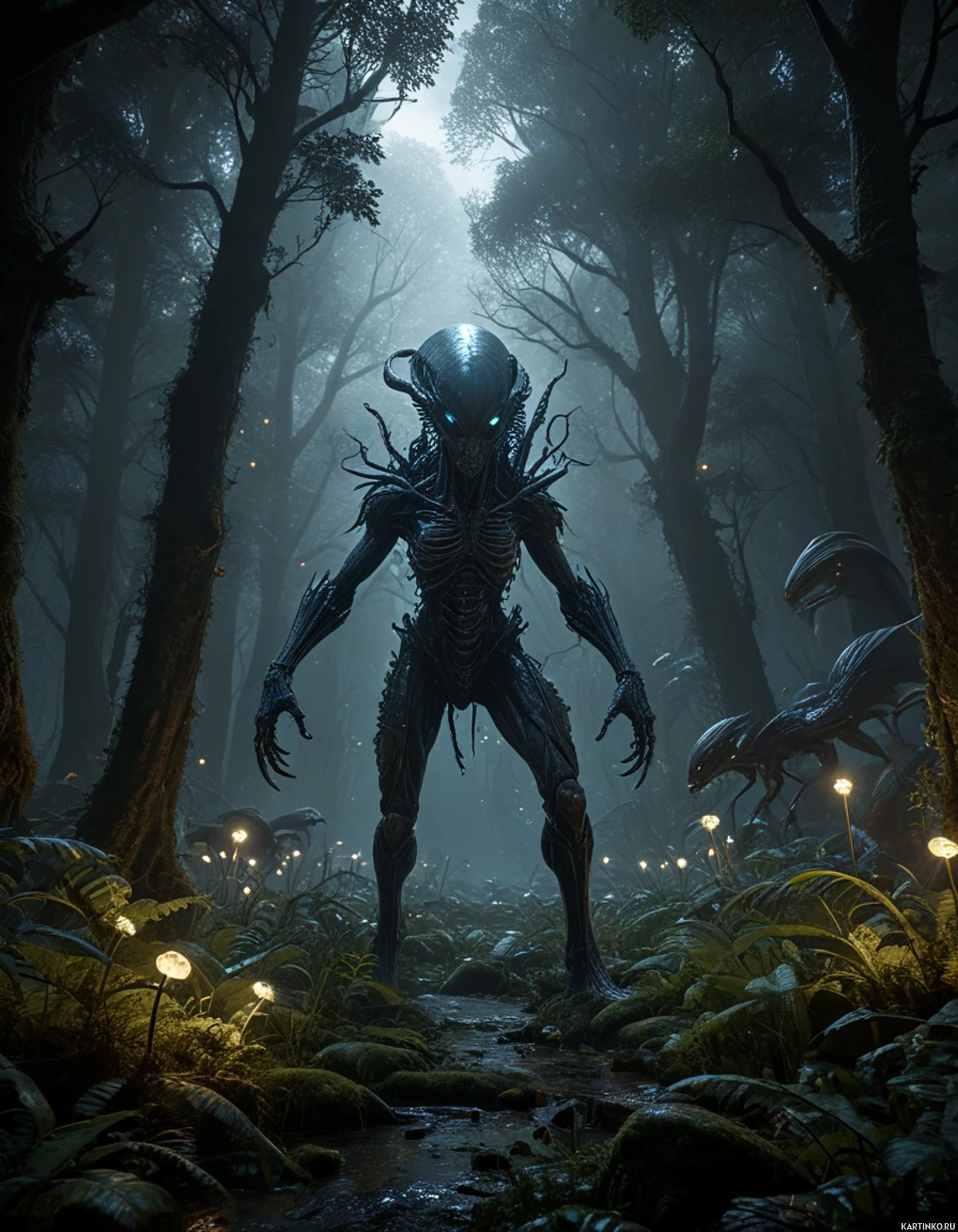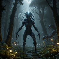 Картинка — научно-фантастическая работа. На ней изображена инопланетная фигура, выходящая из густого леса или джунглей. У инопланетянина неземной вид: светятся голубые глаза и выражение лица угрожающее. Его тело напоминает человеческое, но украшено сложными тёмными узорами, намекающими на передовые технологии или биологию. Существо стоит на тропинке, уходящей вглубь леса, окружённое пышной зеленью и папоротниками. На заднем плане возвышаются высокие деревья, создающие впечатление доисторической или первобытной среды. Освещение в картинке драматичное: лучи света пробиваются сквозь полог, создавая атмосферный эффект и выделяя инопланетянина, уверенно идущего на зрителя.