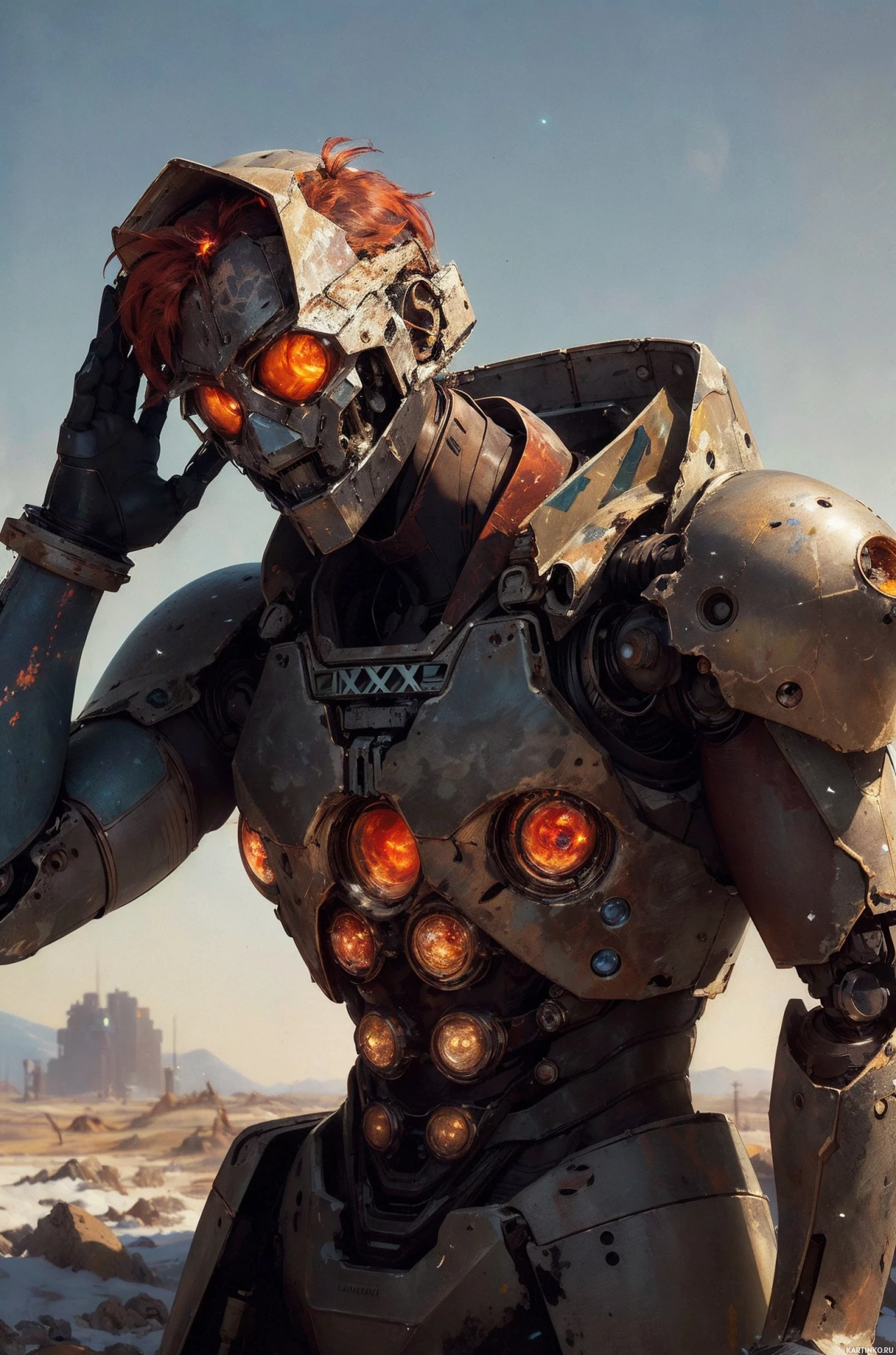 Картинка изображает гуманоидного робота с поврежденной головой. Глаза светятся красным, а на заднем плане – каменистый ландшафт под ясным голубым небом. Тело робота преимущественно серебряное с черными деталями, что придает ему индустриальный вид. Механические суставы и конструкции, похожие на броню, говорят о том, что он создан для боевых действий или тяжелых работ.