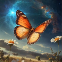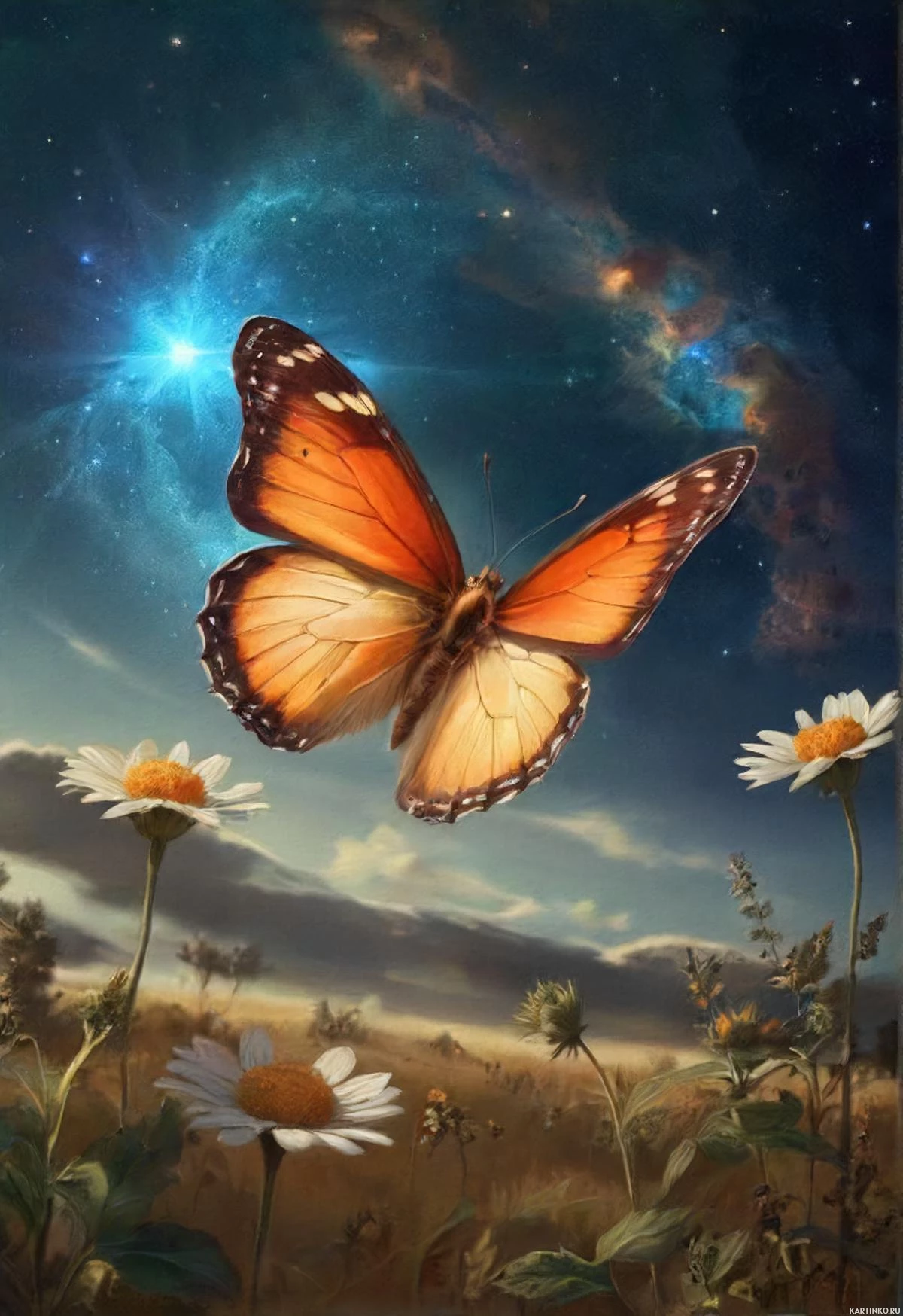 На картинке запечатлена бабочка, насекомое, известное своими крыльями, она взмыла в полет над полем ромашек. Среди травы выделяется один белый цветок с желтой сердцевиной. На заднем плане – впечатляющее небо, полное облаков и звезд, что намекает на рассвет или закат благодаря теплому освещению вокруг бабочки и цветов. Вся сцена создает ощущение безмятежной и волшебной атмосферы.