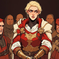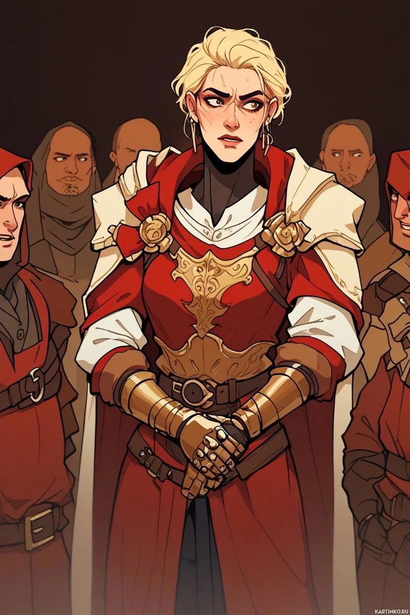 На картинке изображена девушка с золотистыми волосами и уверенным взглядом. На ней доспехи, напоминающие исторический или фэнтезийный наряд, включая шлем с украшением, похожим на перо. Доспехи украшены золотыми деталями, а в правой руке она держит меч. Вокруг нее несколько мужчин в плащах и капюшонах, некоторые из которых носят шлемы или маски в средневековом стиле, скрывающие лица. Все они смотрят на центральную героиню с серьезными выражениями. Фон темный и мрачный, создающий ощущение драматизма и напряжения.