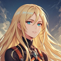 In the image, there's a female character with long blonde hair and blue eyes. She has a youthful appearance with rosy cheeks. Her hair is styled in loose waves that fall around her shoulders. The character is wearing what appears to be armor or a protective gear, featuring straps over the chest area and metal details, including what might be a breastplate. Her expression is neutral and she looks directly at the viewer. The background has a starry sky effect with clouds that add depth to the composition.