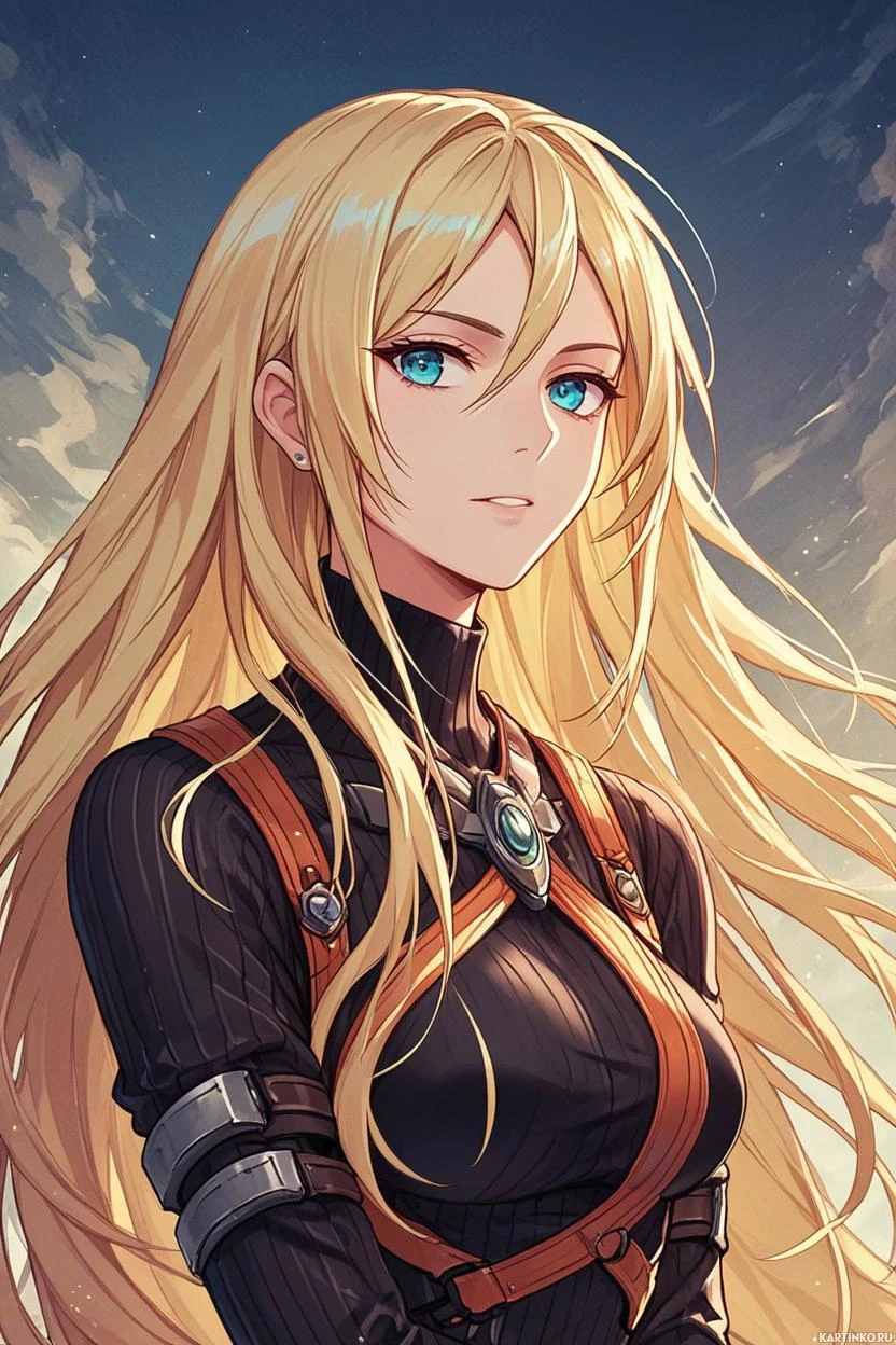 На картинке изображена девушка с длинными светлыми волосами и голубыми глазами. Она выглядит молодой, с лёгким румянцем на щеках. Её волосы уложены в небрежные волны, ниспадающие на плечи. На ней, похоже, доспехи или защитное снаряжение, с лямками на груди и металлическими деталями, возможно, нагрудник. Выражение лица нейтральное, и она смотрит прямо на зрителя. На заднем плане – эффект звёздного неба с облаками, придающими картине глубину.