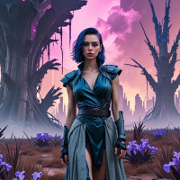 На картинке изображена героиня с голубыми волосами, уложенными в короткую волнистую стрижку. На её лице выражение задумчивости или легкой грусти. Она одета в безрукавный наряд, напоминающий доспехи, что указывает на фантастическую или научно-фантастическую тематику. Вокруг неё – деревья и растения с изогнутыми, корявыми ветвями, создающими ощущение неземного пейзажа. На заднем плане виден большой месяц, освещающий сцену. Общее настроение картинки – драматичное и мрачное.