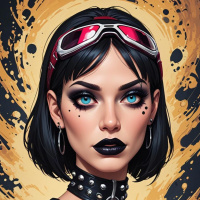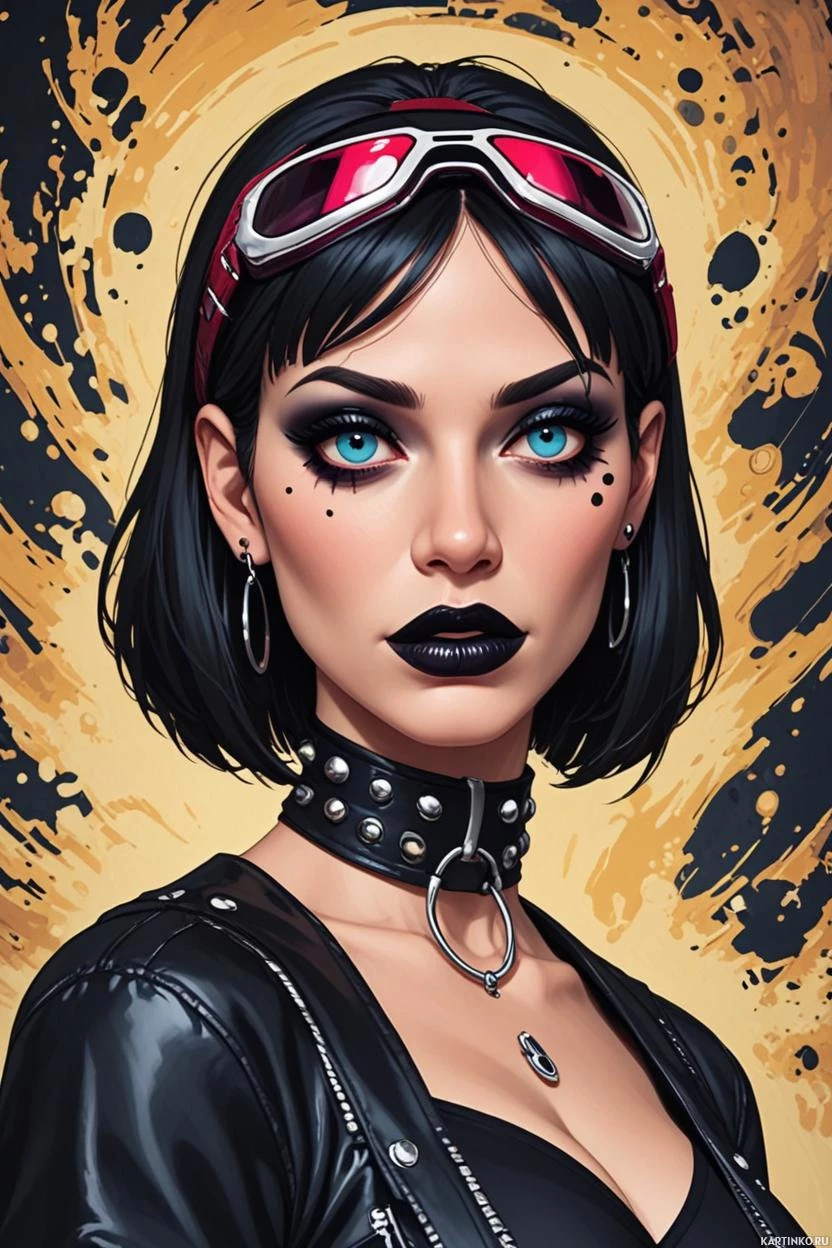 На картинке – стилизованная иллюстрация молодой женщины с короткими волнистыми каштановыми волосами. Её глаза выделяет голубой цвет контактных линз, а общий образ вдохновлен панк-эстетикой: темная помада, белоснежные зубы. На ней черная кожаная куртка поверх корсета или бюстье. Работа отличается яркими цветами и динамичными мазками, которые придают лицу слегка абстрактный вид.