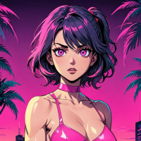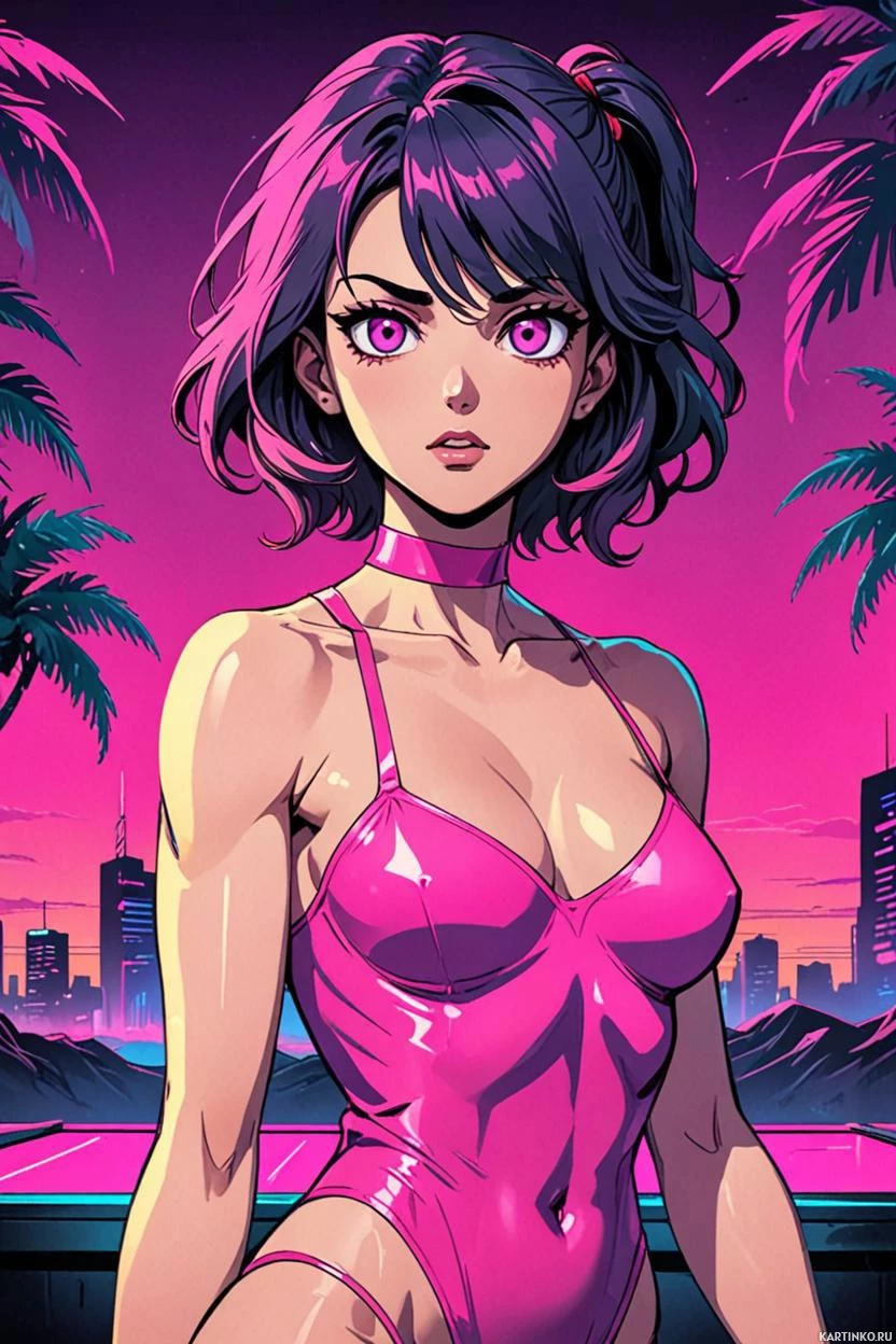 На картинке изображен стилизованный персонаж, похоже на юную девушку. У нее голубые волосы с розовыми прядями, и она одета в облегающий, блестящий комбинезон, который выглядит как костюм из футуристической или ретро-фантастической вселенной. Картинка выполнена в иллюстративном стиле, с яркими цветами и графическим дизайном. На заднем плане — городской пейзаж на закате, судя по теплым оттенкам на горизонте. Слева видны пальмы, что говорит о том, что действие происходит в прибрежной или тропической местности.