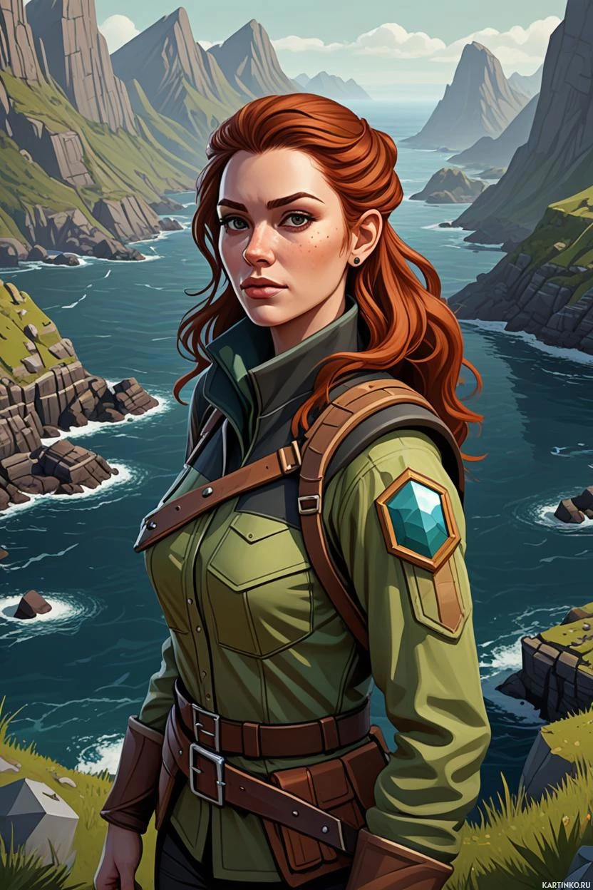 protective gear, along with what looks like a pouch at her waist, possibly holding supplies or tools for her adventures. The overall style of the image is reminiscent of fantasy artwork often found in